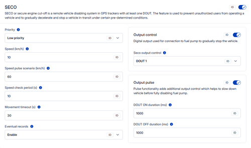 | Output pulse | 12253 | Pulse functionality adds additional output control which helps to slow down vehicle before fully disabling fuel pump. | 0 = Disabled 1 = Enabled |