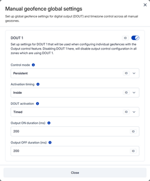 - DOUT ON Duration (ms) – How long DOUT stays ON each cycle (0 or 100–5000 ms).