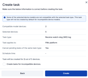 Clicking on Create task and then selecting a task from filtering, say Firmware upgrade, would assign a Firmware upgrade job to selected devices.