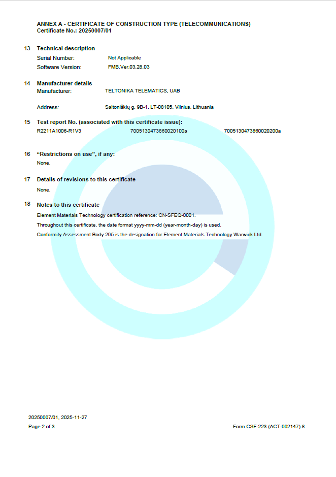 - 14:59, 9 February 2026 Paulius Sakalauskas talk contribs uploaded File:CN-SFEQ-0001 Teltronika 20250007 01MIC-T.pdf
