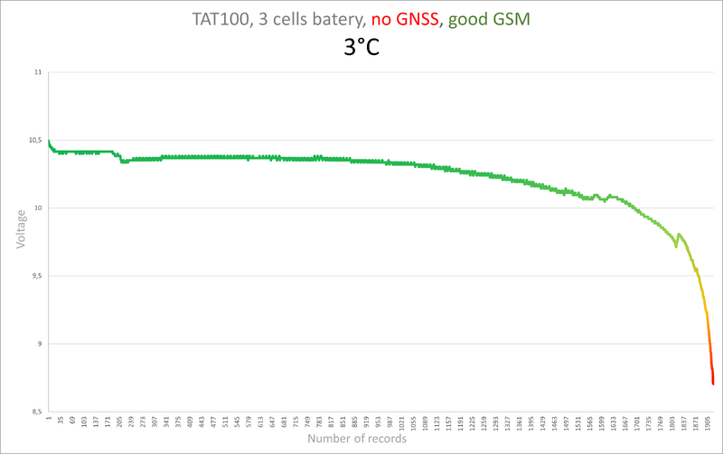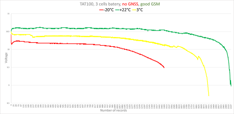 Battery replacement could be scheduled based on the received battery voltage values in the records. Here are recommendations for replacing the battery before it completely discharges. In the picture below, there are three curves depicting the battery voltage in different temperature environments. Each curve exhibits distinct properties; as observed from the graph, in higher temperatures, the battery discharges more rapidly towards the end, but the device is capable of sending more records. The curve for lower temperatures maintains a more consistent decline before a sudden drop.